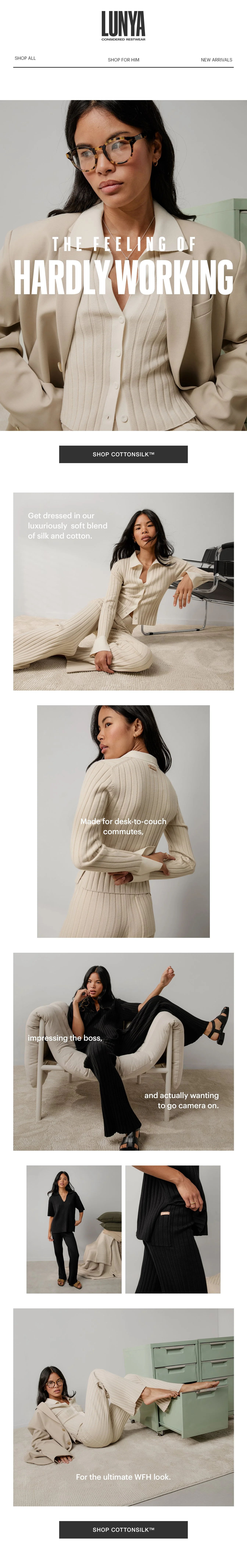 WFH launch messaging wasn’t about dressing down. It was about dressing smarter. By leaning into humor and WFH rituals, the campaign became rooted in product relevance (while reinforcing material luxury). Cottonsilk™ became the answer to modern work life. Comfortable, yes, but also, unmistakably considered.